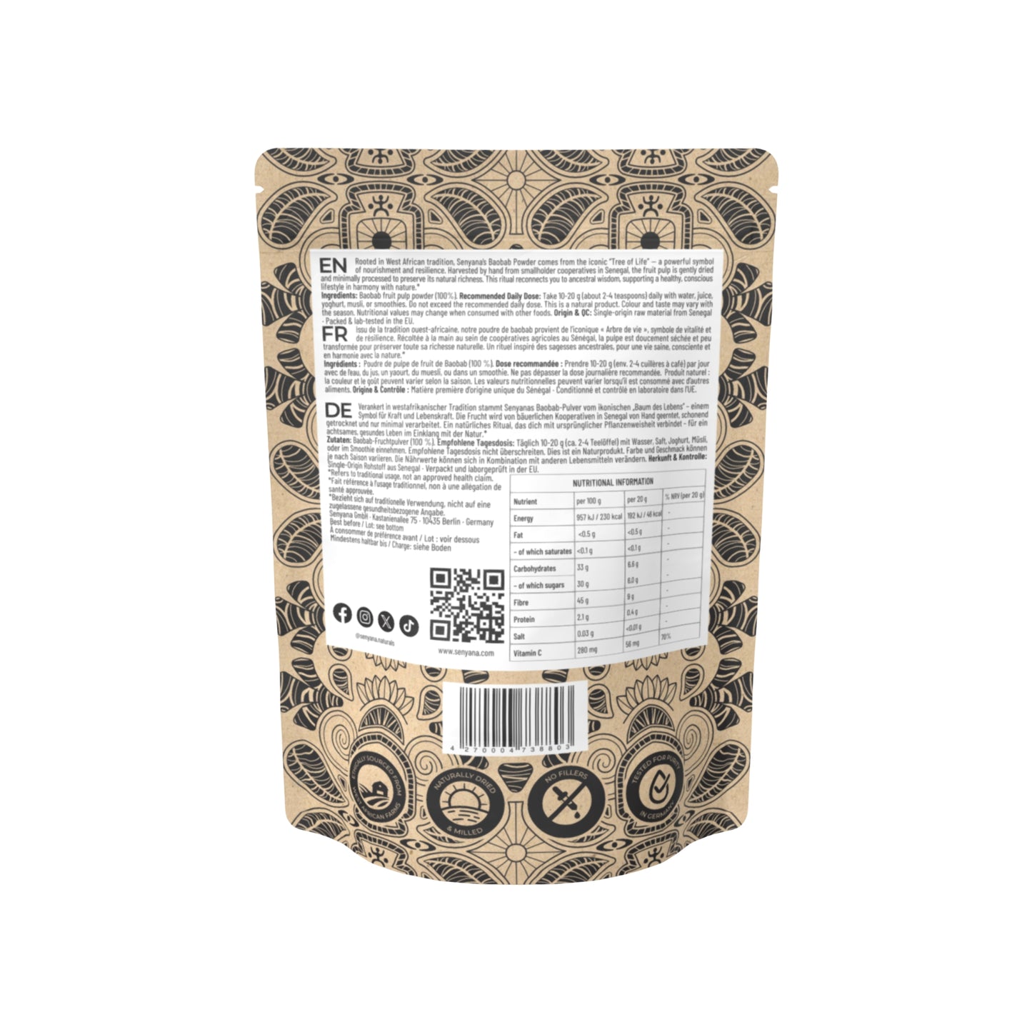 Our baobab powder is made from naturally dried baobab fruit, with no additives, preservatives, or fillers— just pure, nutrient-rich goodness. Sourced sustainably, it retains all its natural vitamins, minerals, and fiber to support your health and well-being.